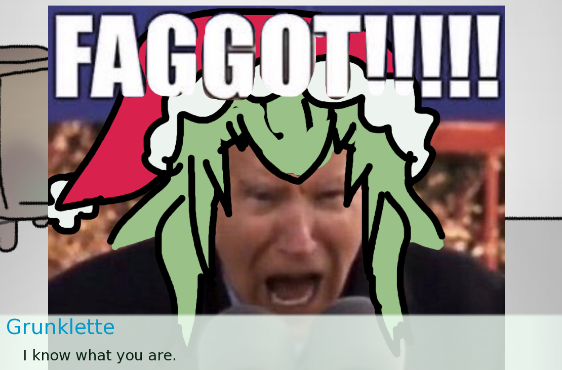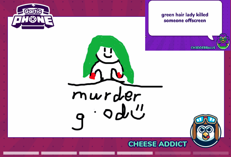 Three drawings from a Gartic Phone session. The original prompt, "Grunklette killing", was drawn by Jack. The prompt derived from his drawing, "green hair lady killed someone offscreen", was drawn by Google. The prompt derived from his drawing, "Green haired girly is to influencing killing god (sic)", was drawn by RJ. While Grunklette becomes "green hair lady," I consider these recognizable enough to put here. Dated November 11th.