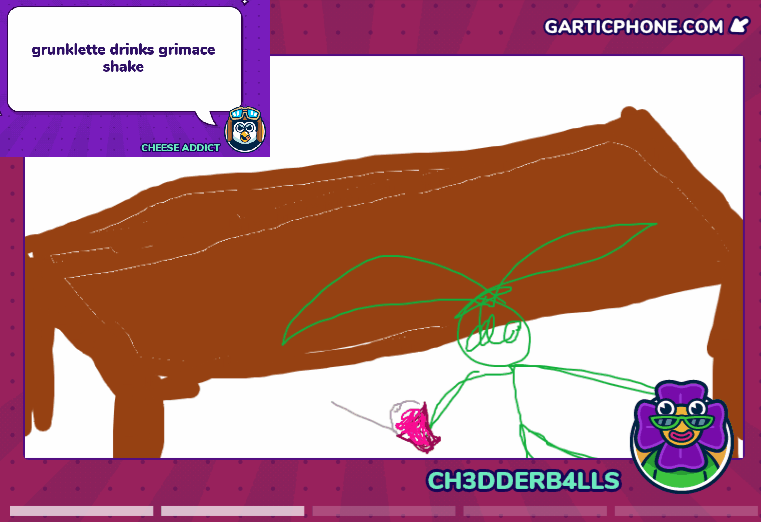 Two drawings from a Gartic Phone session. The original prompt, "grunklette drinks grimace shake", was drawn by Remy. The prompt derived from his drawing, "grunklette drinking the grimace shake", was drawn by Kiel. Dated November 11th.
